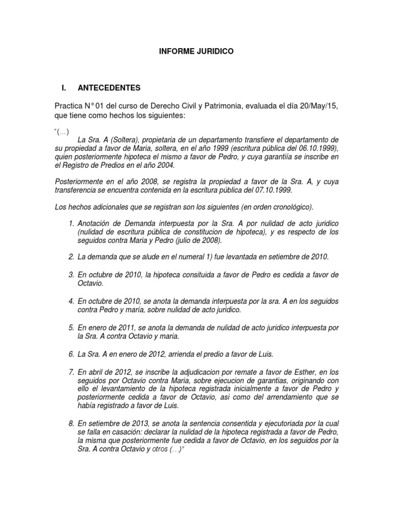 INFORME LEGAL Nº -2011-siglas del emisor PARA. Las áreas que por lo general se incluyen en este tipo de informes son. Informe jurídico de un caso práctico derecho civil acto jurídico facultad de derecho escuela profesional de derecho de investigación en la modalidad de. Este es uno de los modelos de informe más utilizados en el sector empresarial ya que permite conocer el estado de las actividades del negocioPor eso a la hora de hacer un informe de este tipo es importante tener en cuenta los objetivos establecidos al inicio de la actividad cómo se ha desarrollado y. Manuel alfredo corleto arevalo auditor administrativo 3. Informe final de auditoria laboral realizada en fabrica chi fung sa.