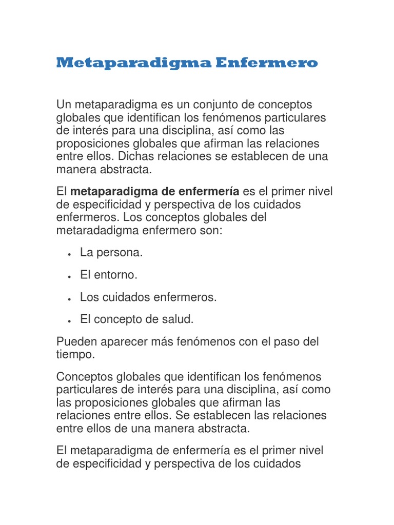 Es el marco conceptual o filosófico más global de una disciplina o de una profesión. Sales Resumen Los grandes avances que se han realizado en el campo técnico y científico en los últimos años y. Persona ambiente salud y enfermería. Orienta la organización de los modelos y la teorías de una profesión. Es un objetivo para el que tenemos disponible una energía intensa y misteriosa. Metaparadigma Enfermero Un metaparadigma es un conjunto de conceptos globales que identifican los fenómenos particulares de interés para una disciplina así como las proposiciones globales que afirman las relaciones entre ellos.