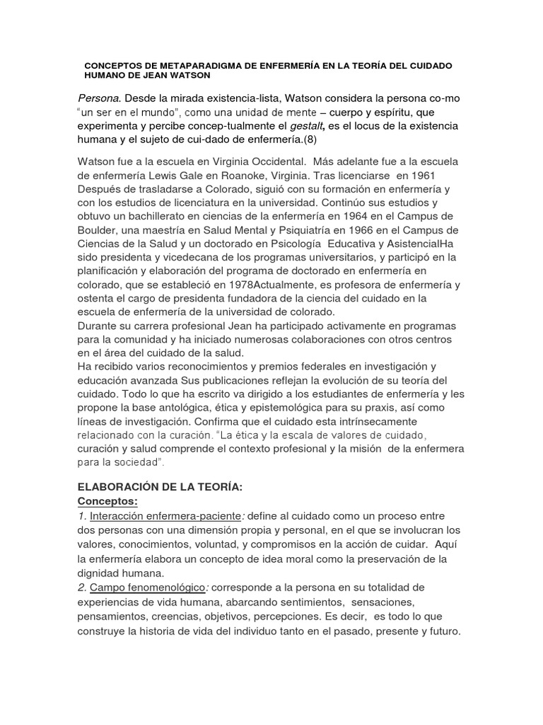Conceptos De Metaparadigma De Enfermeria En La Teoria Del Cuidado Humano De Jean Watson Pdf Enfermeria Desarrollo Personal