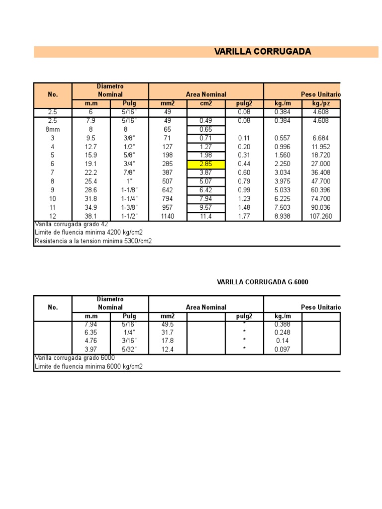Tabla 6-6 Barras Corrugadas - Características de adherencia valores mínimos Diámetro nominal mm Tensión media ττττm MPa Tensión de rotura ττττu MPa inferior a 8 690 1130 de 8 a 32 780 012d 1270 019d superior a 32 410 680 Tabla 6-7 Barras Corrugadas - Coeficiente de aceptación k en función del tamaño de la. Características de la Varilla. 0 A un 0 le pareció que este documento no es útil Marcar este documento como no útil. Estas corrugaciones deben satisfacer requisitos mínimos para ser tomadas en cuenta en el diseño. VARILLAS DELGADAS Generalmente presenta una resistencia fy 4200 kgcm2 aunque también se fabrican en fy 6000 kgcm2 y diámetros en pulgadas de 532 316 14 y 516 con longitud de 6 y 12m. El tipo de fibra de su composición nos dará el nivel de resistencia y la utilización en refuerzos estructurales o sustituciones de armados metálicos.