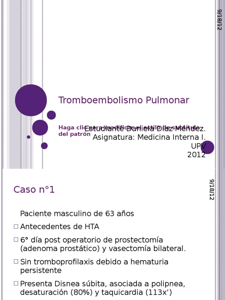 El infarto pulmonar secundario a embo-. Estudios postmortem han demostrado que aproximadamente el 60 de los pacientes que han muerto de forma intrahospitalaria presentaron tromboembolia pulmonar y que el diagnóstico no se realizó en el 70 de los pacientes. Massive pulmonary thromboembolism treated successfully with streptokinase. Tromboembolismo pulmonar masivo con respuesta exitosa a trombolisisfarmacológica. Mujer de 25 años que acude a urgencias por cuadro de disnea que empezo con grandes esfuerzos y ahora se intensifica a esfuerzos apena minimos. Microsoft PowerPoint - CASO CLINICO Author.