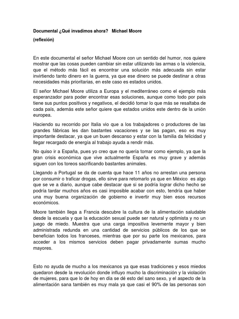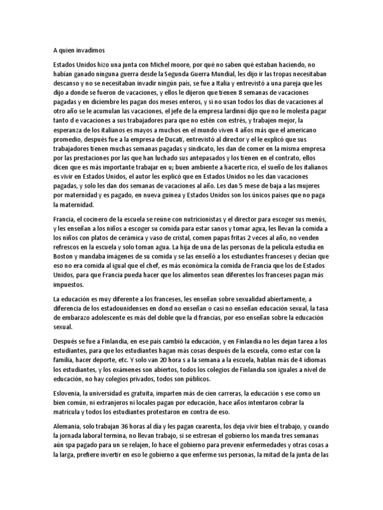 Para ello decide viajar a invadir nuevos territorios. En resumen una muy interesante comedia-documental al estilo de Michael Moore sobre experiencias y políticas sociales aplicadas en diferentes países del mundo que Estados Unidos. Que sufrió un accidente donde perdió parte de los dedos anular y medio. Contenido Resumen1 EEUU vs Otros países1 Ideas olvidadas y acopladas por otros países2 Algunas diferencias a detalle entre los países expresados en el documental y EEUU3 Conclusión6 Citas Bibliográficas6 1 Resumen Este ensayo estará basado en el Documental de Michael Moore conocido como Que invadimos ahora este nos habla de. Where to Invade Next Michael Moore Estados Unidos 2015. En este trabajo Moore crea una crítica por cierto poco sutil a muchos problemas que se evidencian en el país estadounidense.