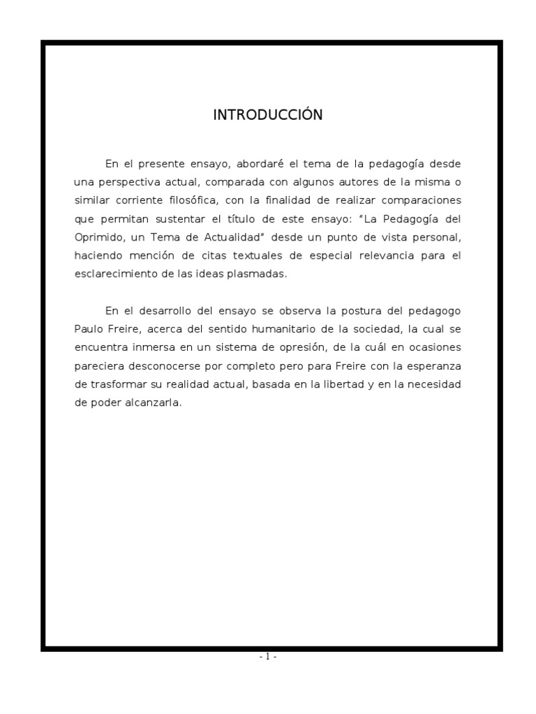 La mayoría de nosotros hemos oído hablar alguna vez de Paulo Freire conocido por su importante papel en la pedagogía del siglo XXEs conocido como el pedagogo de los oprimidos transmitiendo a su vez la pedagogía de la esperanza. Freire muestra su preocupación por. LA LECTURA PEDAGÓGICA A FREIRE Una verdadera educación con visión futurista como la pensada por el autor está basada en la problematización. La pedagogia del oprimido el autor comienza por darnos una explicación del porqué del título del libro la pedagogía del oprimido ya que nos explica que muchas personas comienzan a deshumanizarse y comienzan a deshumanizar a las demás personas a estos los llama opresores y los oprimidos que son los menos deben de ser los que recuperen su. ENSAYO LA PEDAGOGIA DEL OPRIMIDO PAULO FREIRE INTRODUCCION El presente ensayo trata sobre la Pedagogía del Oprimido el cual cuenta con cinco importantes capítulos y aportaciones de algunos pensamientos de varios autores dicho libro nos relata acerca de la opresión que se le hace a la sociedad en general. La Pedagogía del Oprimido se compone de un proceso revolucionario en fases.